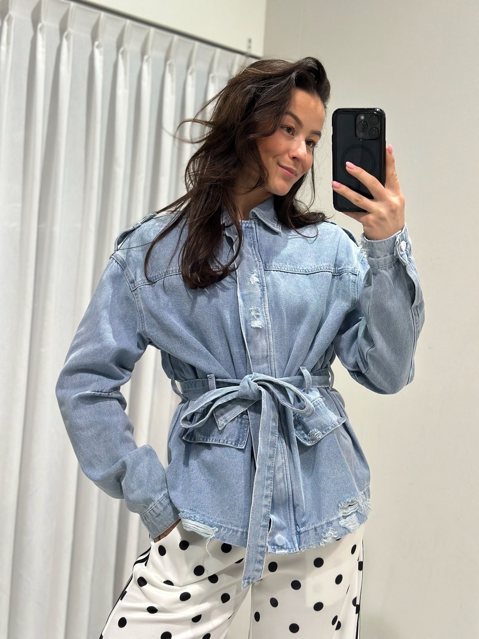 Trend alert! Stoere denim jacket met centuur.